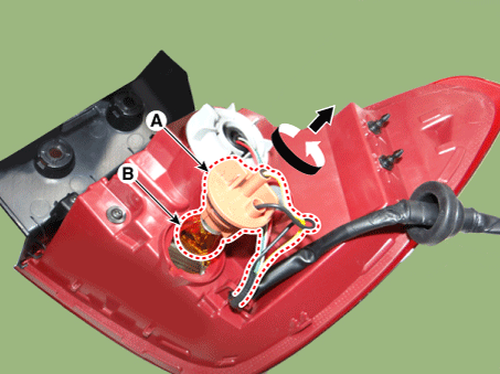 Снимите лампу фонаря заднего хода (В), повернув патрон (А) против часовой стрелки.