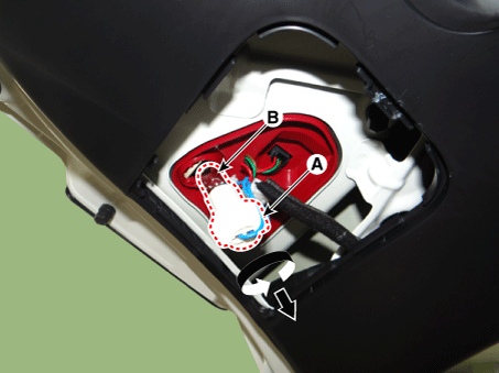 Снимите лампу указателя поворота (В), повернув патрон (А) против часовой стрелки.