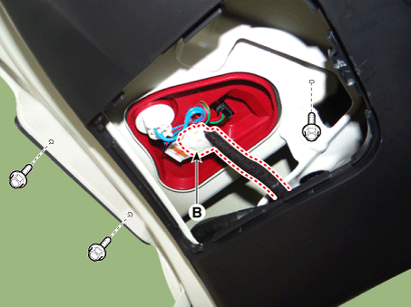 Отсоедините разъем (В) и снимите задний комбинированный фонарь. (А) после ослабления гаек.