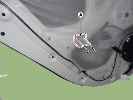 Отсоедините разъем динамика передней двери (А), а затем снимите клипсы крепления проводки.