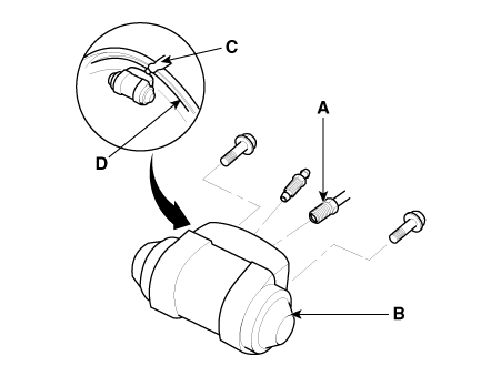 Нанесите герметик (C) между колесным цилиндром (B) и опорной пластиной (D), и установите рабочий цилиндр.