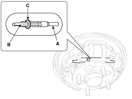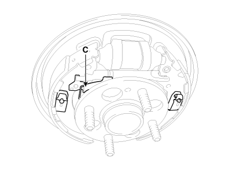Подцепите рычаг регулятора колодки (C), затем установите его на тормозную колодку.