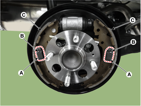 Снимите пружины крепления колодок (A) и штифты крепления башмаков (B), а затем снимите тормозная колодка (С). Следите за тем, чтобы не повредить пылезащитную крышку на колесном цилиндре.