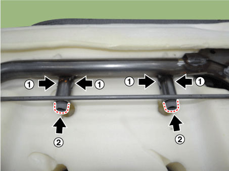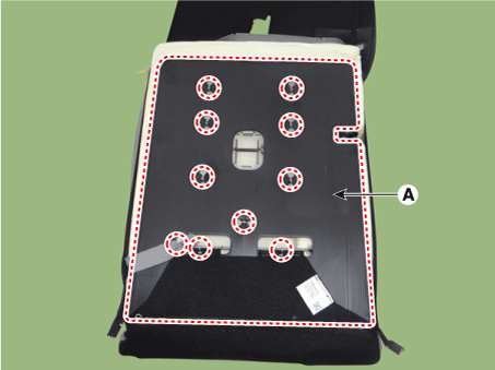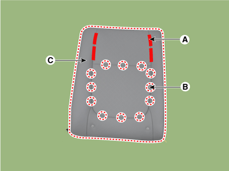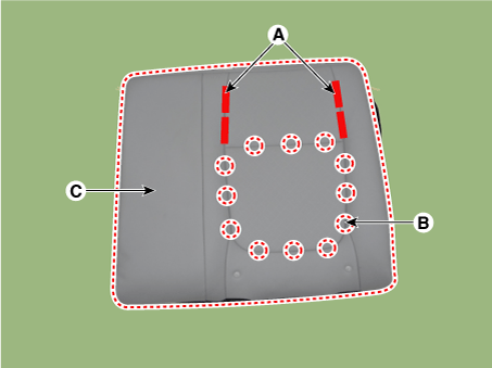 Снимите обивку спинки переднего сиденья (C) после удаления ленты-липучки. (A) и кольцевой зажим (B).