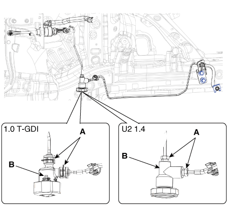 Снимите воздухоочиститель. D 1.4 U2 TCI (см. Механическая система двигателя — «Воздушный фильтр») G 1.0 T-GDI (см. Механическая система двигателя — «Воздушный фильтр») |