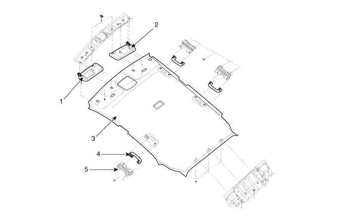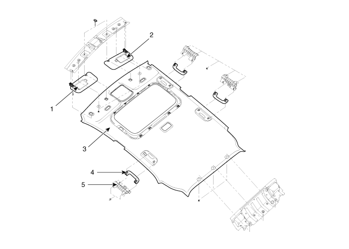 2. Солнцезащитный козырек в сборе [правый] 3. Отделка крыши в сборе [люк] |