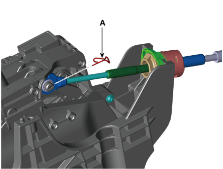 Снимите трос переключения передач с оси рычага переключения передач после удаления защелки. штифт (А).