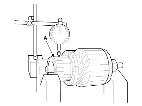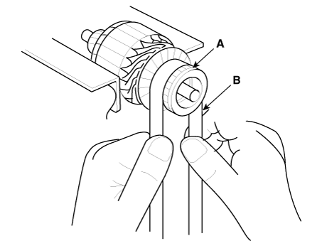 Проверьте поверхность коллектора (А). Если поверхность загрязнена или обожжена, наждачной бумагой или на токарном станке в соответствии со следующими спецификациями, или восстановить наждачной бумагой #500 или #600 (B).