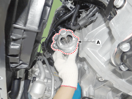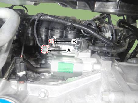 Снимите гайку крепления клеммы "В" соленоида стартера (В), а затем отсоедините кабель стартера и разъем ST (А).