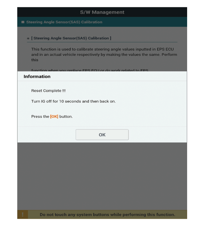 Выберите «Калибровка датчика угла поворота рулевого колеса (SAS)» на экране KDS, затем выберите ОК. |