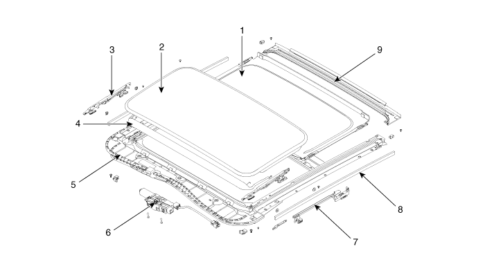 2. Стеклянная панель люка в сборе 3. Направляющая люка в сборе 4. Дефлектор люка в сборе 5. Подрамник люка в сборе |