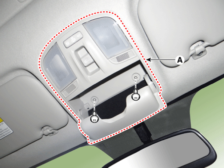 Откройте крышку футляра для солнцезащитных очков с потолочной консоли и снимите 2 винта, удерживающие потолочную консоль. Отсоедините разъем выключателя и Сопоставьте разъем лампы, а затем снимите лампу на потолочной консоли (A).