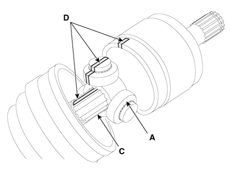 Нанесите установочные метки (D) на узел ролика крестовины (A), Корпус TJ (B) и шлицы вала (C) для облегчения повторной сборки.