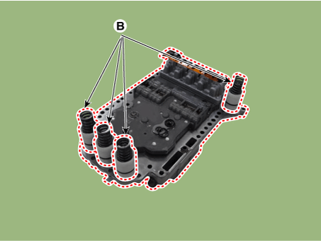 Снимите узел корпуса клапана (A) с аккумуляторами (B) после ослабления болты крепления корпуса клапана.