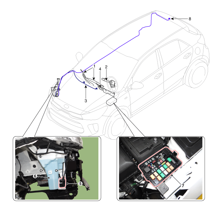 6. Бачок омывателя 7. Реле стеклоочистителя/омывателя. 8. Шланг и форсунка заднего омывателя |