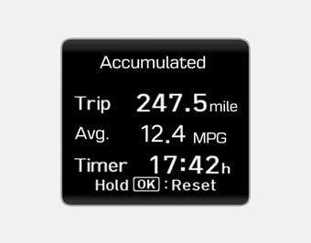 Чтобы вручную сбросить информацию, нажмите и удерживайте кнопку OK при просмотре. Накопленная информация о вождении. Расстояние поездки, средний расход топлива и общий время вождения будет сброшено одновременно.