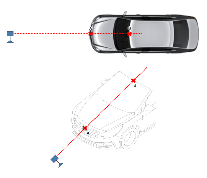 Отметьте центральную точку эмблемы (A) и центральную точку в верхней части ветрового стекла (B).