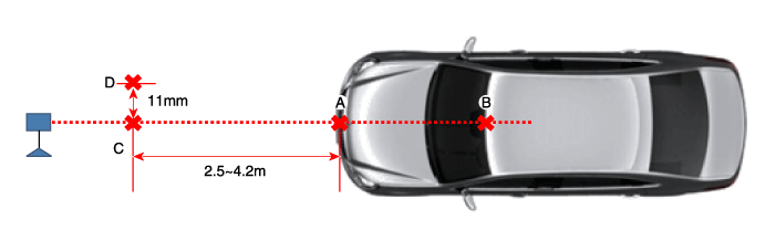 Метка (C), расположенная в 2,5~4,2 м от (A) впереди автомобиля.