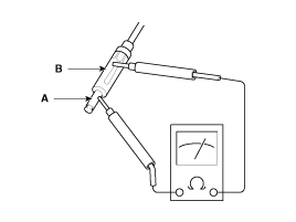 Проверьте сопротивление провода радиоантенны между клеммами разъема антенны (А) и массой кузова (В).