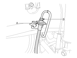 Отсоедините тормозную трубку, ослабив накидную гайку трубки (В).