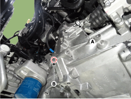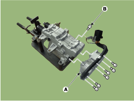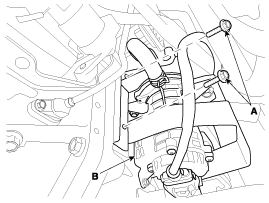 Снимите электродвигатель привода сцепления (А) и болт заземления (В).