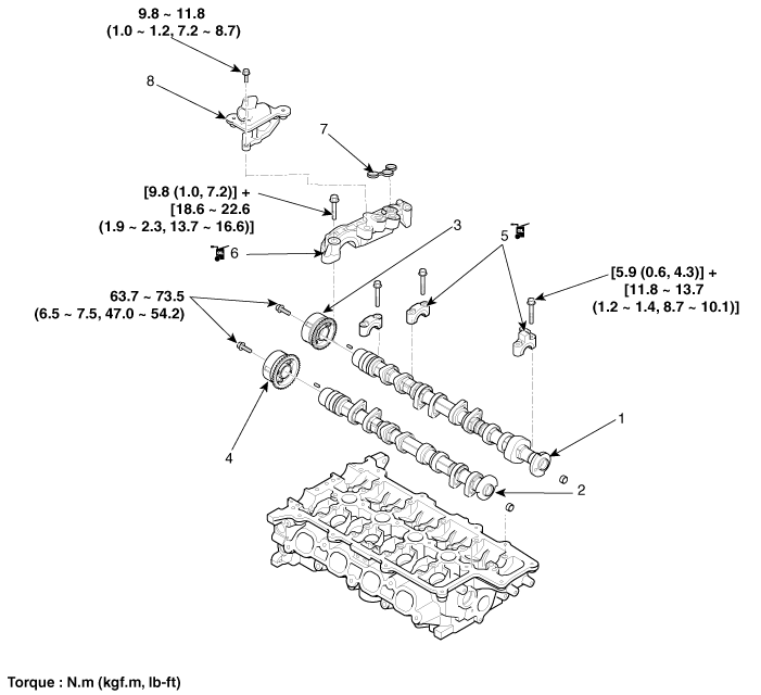 Hyundai Sonata: Головка блока цилиндров в сборе / CVVT и компоненты распределительного вала и расположение компонентов
