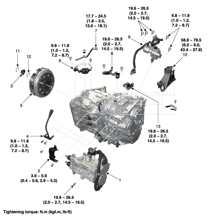 2. Крышка вилки 3. Сплайн-концентратор 4. Датчик частоты вращения входного вала 1, 2 5. Двойное сцепление в сборе 6. Переключатель блокировки 7. Ручной рычаг |