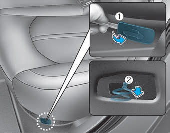 Откройте крышку кабеля (1) под задним сиденьем с помощью механического ключа и потяните за трос (2) для отпирания багажника.