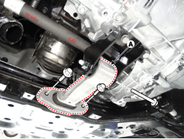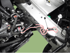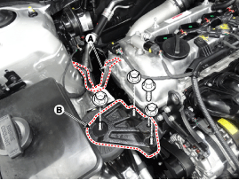Отсоедините кабель заземления (А) и снимите опорный кронштейн подвески двигателя (В).