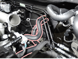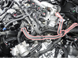 Отсоедините топливный шланг (А) и шланг (В) электромагнитного клапана управления продувкой (PCSV).