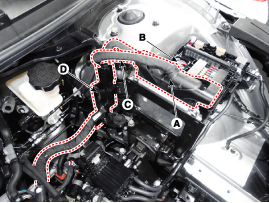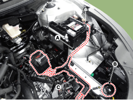 разъем (B) от блока предохранителей/реле и провод заземления двигателя (C).