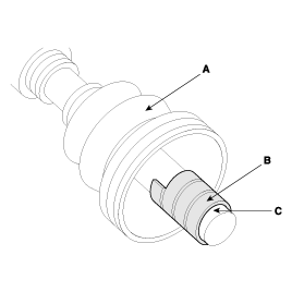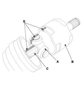 Сделайте установочные метки (D) на узле ролика крестовины (A), корпусе шарнира (B) и шлице вала (C), чтобы облегчить повторную сборку.