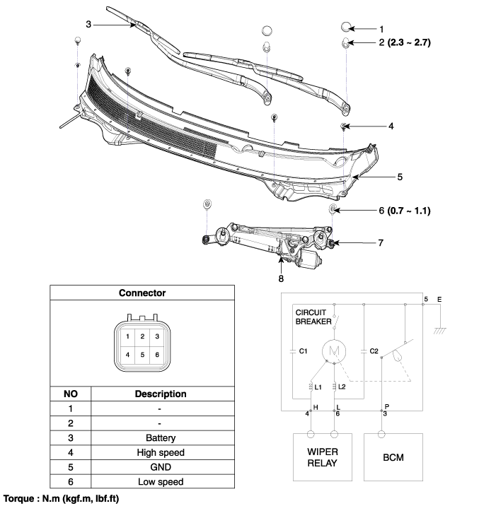 Hyundai Sonata: Компоненты и расположение компонентов двигателя стеклоочистителя/омывателя ветрового стекла/переднего стеклоочистителя