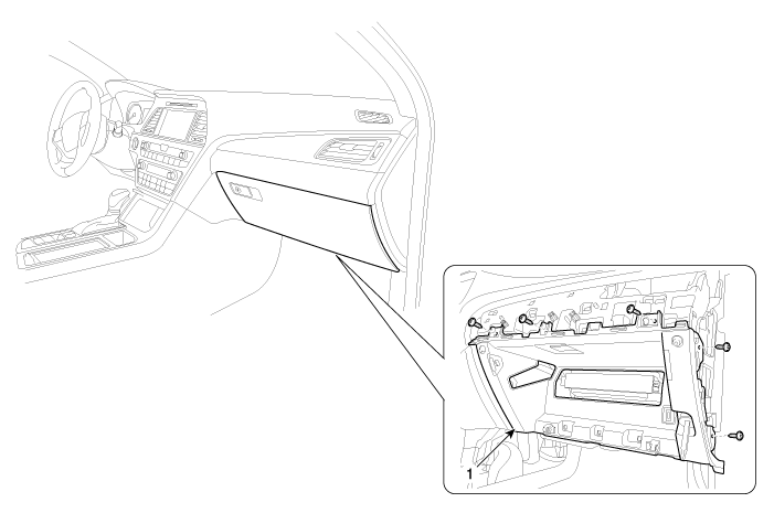 Hyundai Sonata LF 2014-2019 Руководство по ремонту / Кузов (внутри и снаружи) / Аварийная площадка / Расположение компонентов верхней крышки перчаточного ящика в сборе и их расположение