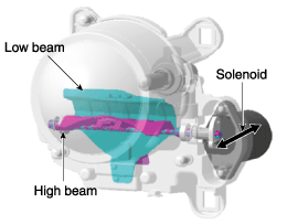 Свет управляется вращением экрана, вставленного в объектив (используется соленоид)