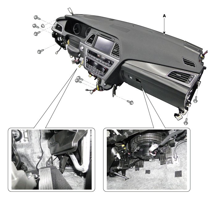 Ослабив болты, снимите основную защитную накладку и поперечину капота в сборе (А) вместе.