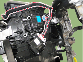 Снимите блок отопителя и вентилятора (А) с защитной накладки (В), предварительно ослабив крепежные гайки.