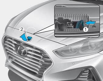 3. Слегка приподнимите капот, поднимите вторичную защелку (1) внутри капота. отцентрируйте и поднимите капот (2). После того, как он будет поднят примерно наполовину, он поднимется полностью само собой.