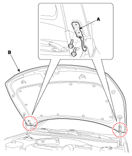 Ослабив болты крепления петли капота (А), снимите капот в сборе (В).