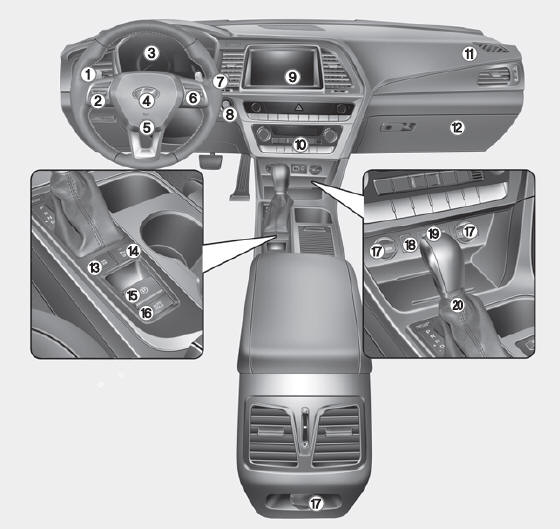Hyundai Sonata LF 2014-2019 Руководство по техническому обслуживанию: Компоненты обивки крыши в сборе и расположение компонентов