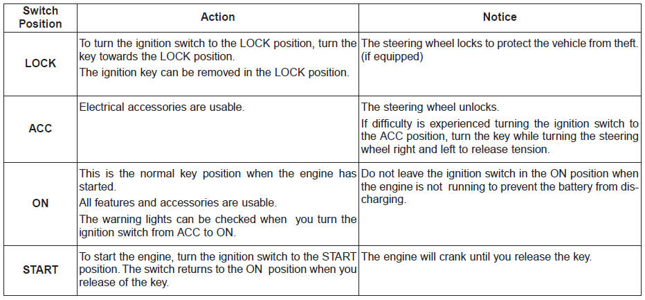 НИКОГДА не переводите ключ зажигания в положение LOCK или ACC, когда автомобиль находится в движении, за исключением аварийных ситуаций. Это приведет к выключению двигателя и потеря усилителя рулевого управления и тормозной системы. Это может привести к потере функции управления направлением движения и торможения, что может привести к аварии.