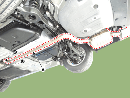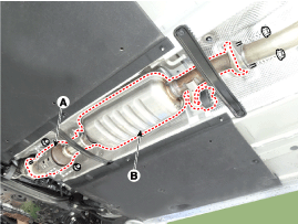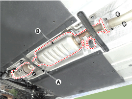Снимите каталитический нейтрализатор и центральный глушитель (В).