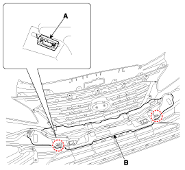 Снимите монтажный зажим (А), а затем снимите амортизатор переднего бампера (В).