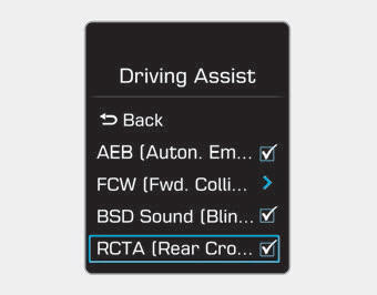 Перейдите в режим пользовательских настроек (помощь при вождении) и выберите RCTA (заднее поперечное движение). Предупреждение) на ЖК-дисплее (более подробную информацию см. в разделе «ЖК-дисплей» в главе 3). Система включится и будет находиться в режиме ожидания для активации. Система активируется, когда автомобиль скорость ниже 6 миль/ч (10 км/ч), когда рычаг переключения передач находится в положении R (задний ход).