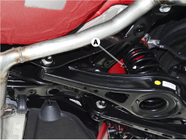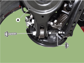 Ослабьте болт и гайку крепления нижнего рычага (А). Затем снимите нижний рычаг с заднего держателя.