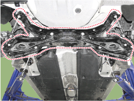 После установки домкрата ослабьте болты и снимите задний подрамник.