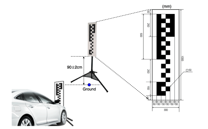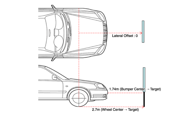Калибровочная мишень должна располагаться на расстоянии 2,7 м от центра переднего колеса (на расстоянии 1,74 м от бампера).