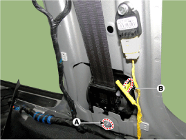 Подсоедините разъем преднатяжителя ремня безопасности (В).