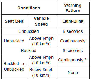 Сигнализатор непристегнутого ремня безопасности водителя и звуковой сигнал загорятся в следующей таблице, когда ключ зажигания находится в положении ON.