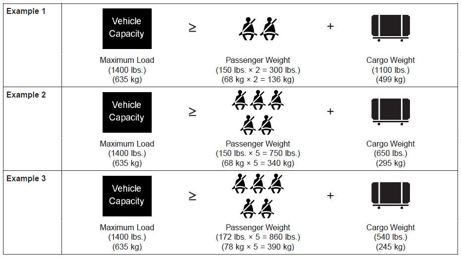 Вместимость — это максимальное количество пассажиров, включая водителя, вашего транспортное средство может перевозить. Однако количество сидячих мест может быть уменьшено в зависимости от веса. всех пассажиров и вес перевозимого или буксируемого груза. Делать не перегружайте автомобиль, так как существует ограничение на общий вес или ограничение по нагрузке включая пассажиров и груз, который может перевозить автомобиль.